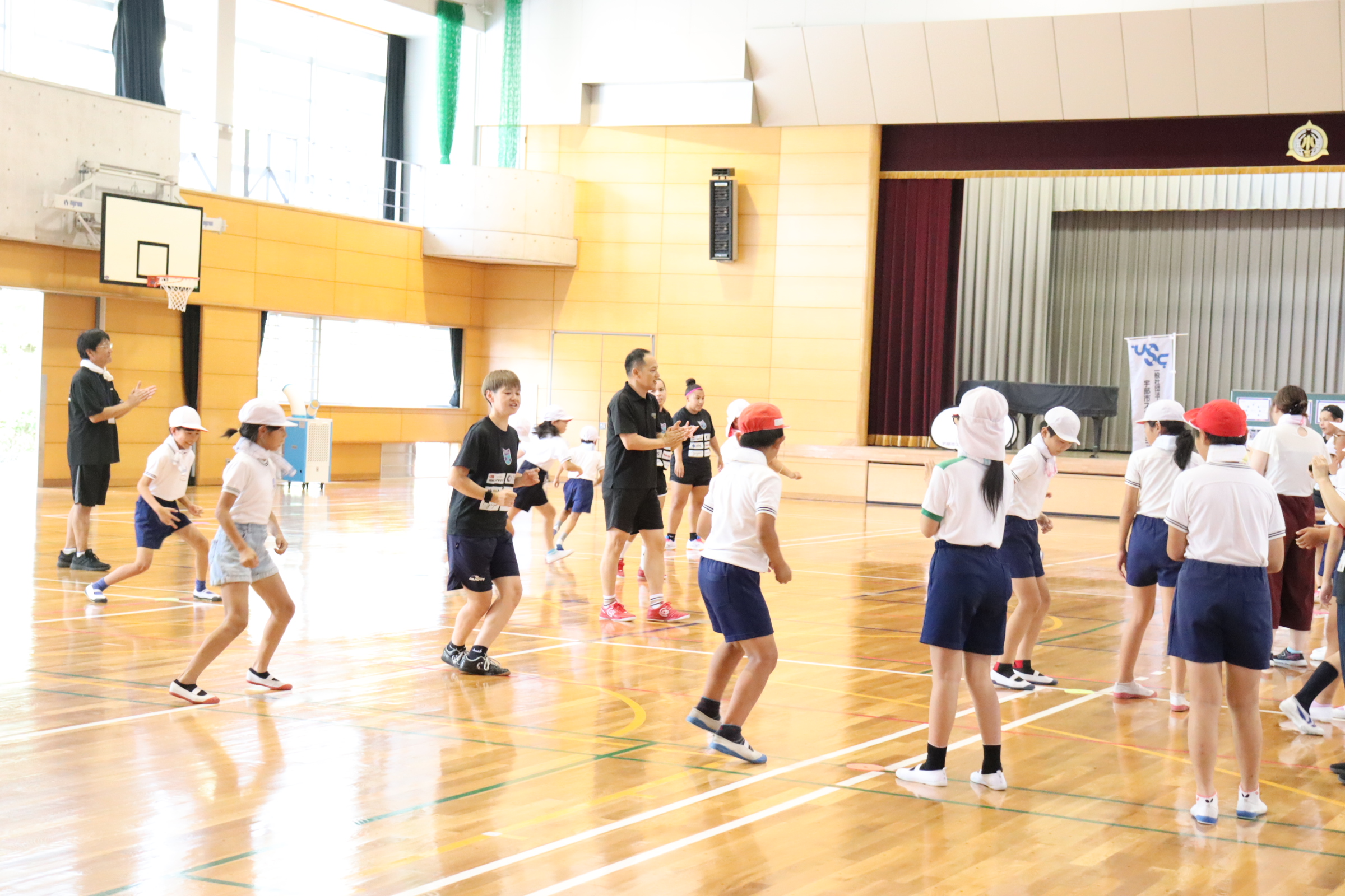 リズムジャンプ、パス練習、そしてミニゲームを行いました。最後はタッチしてお別れ。10月に宇部で試合があるそうです。みんなで地元のチームを応援しましょう。