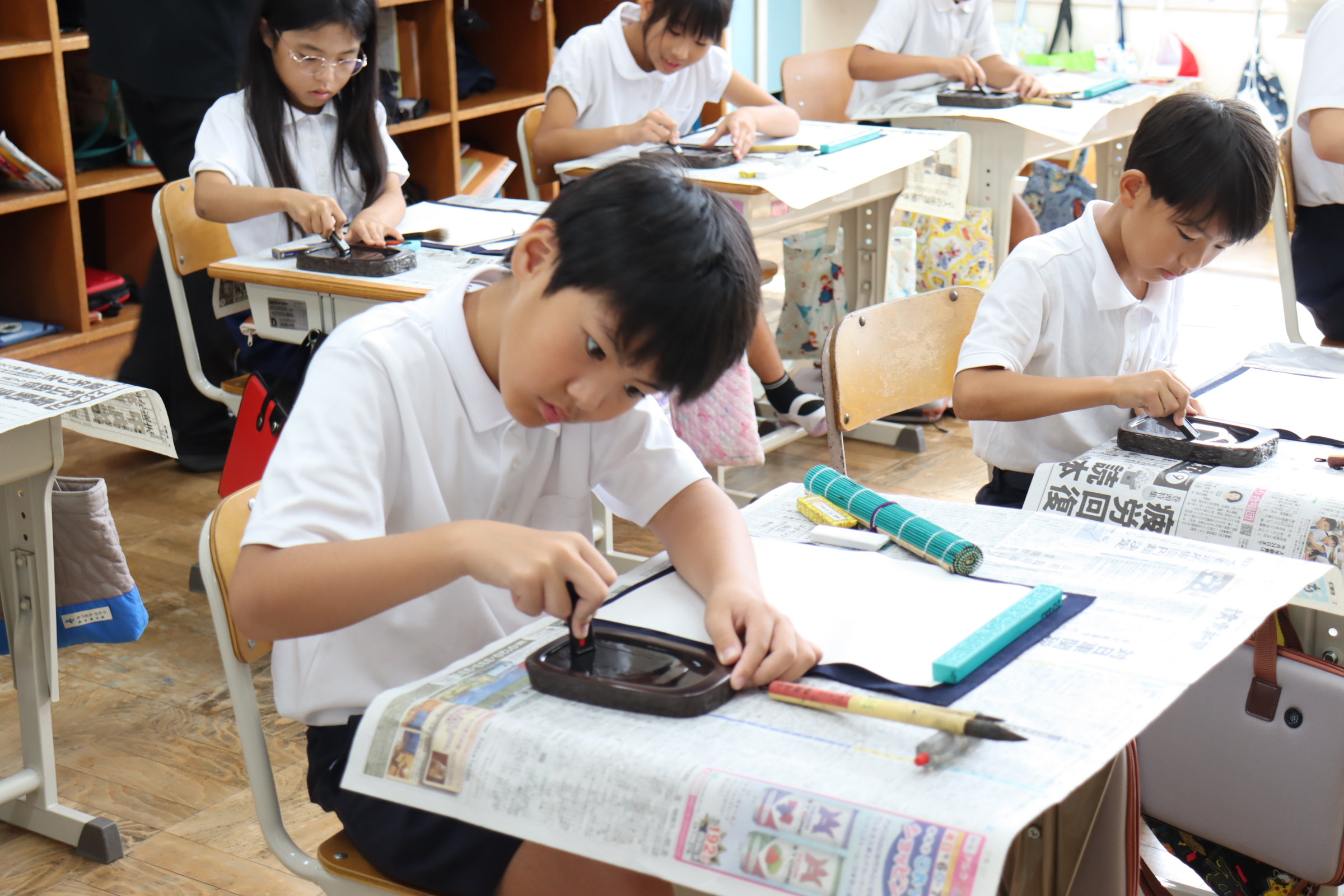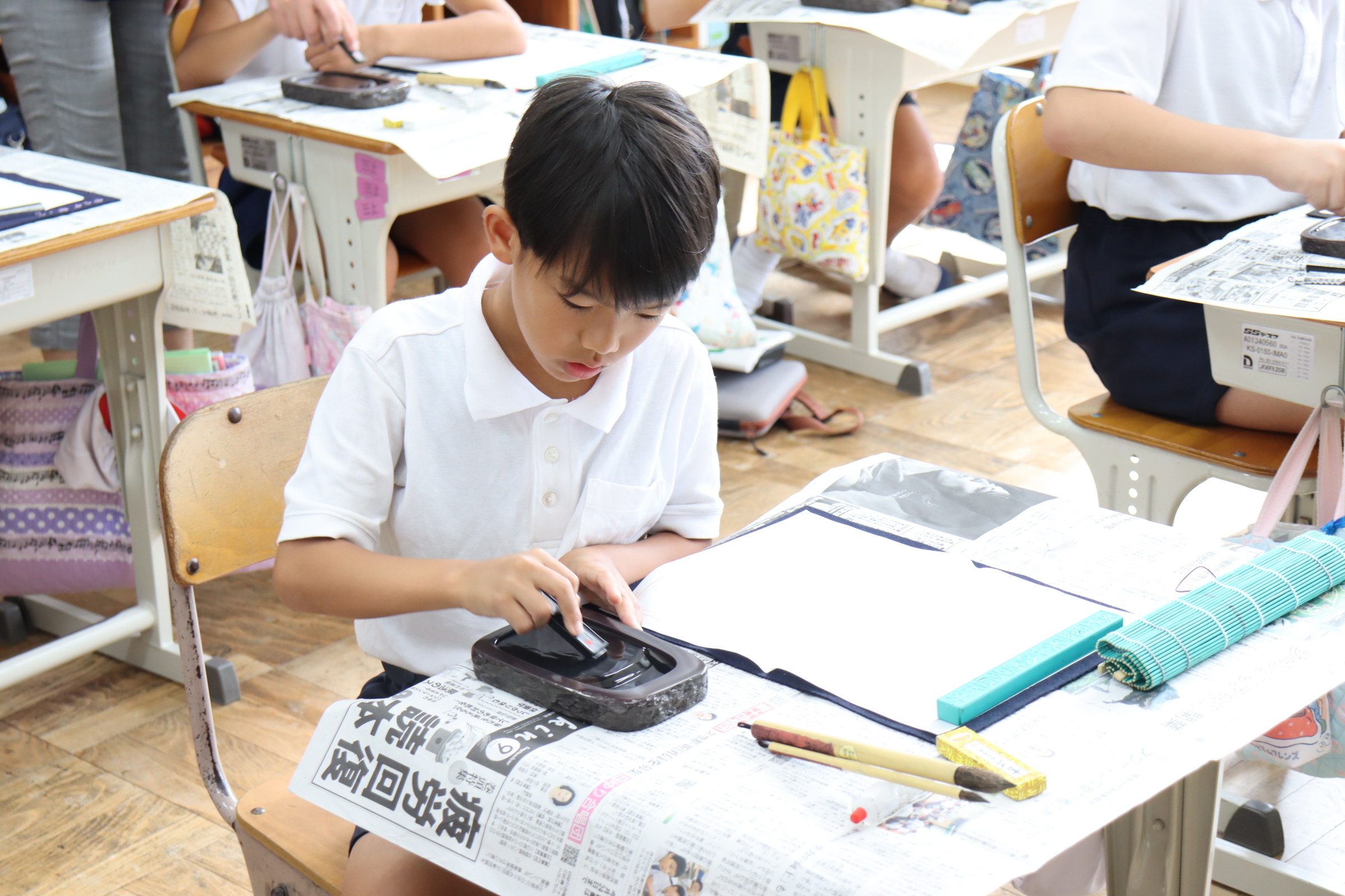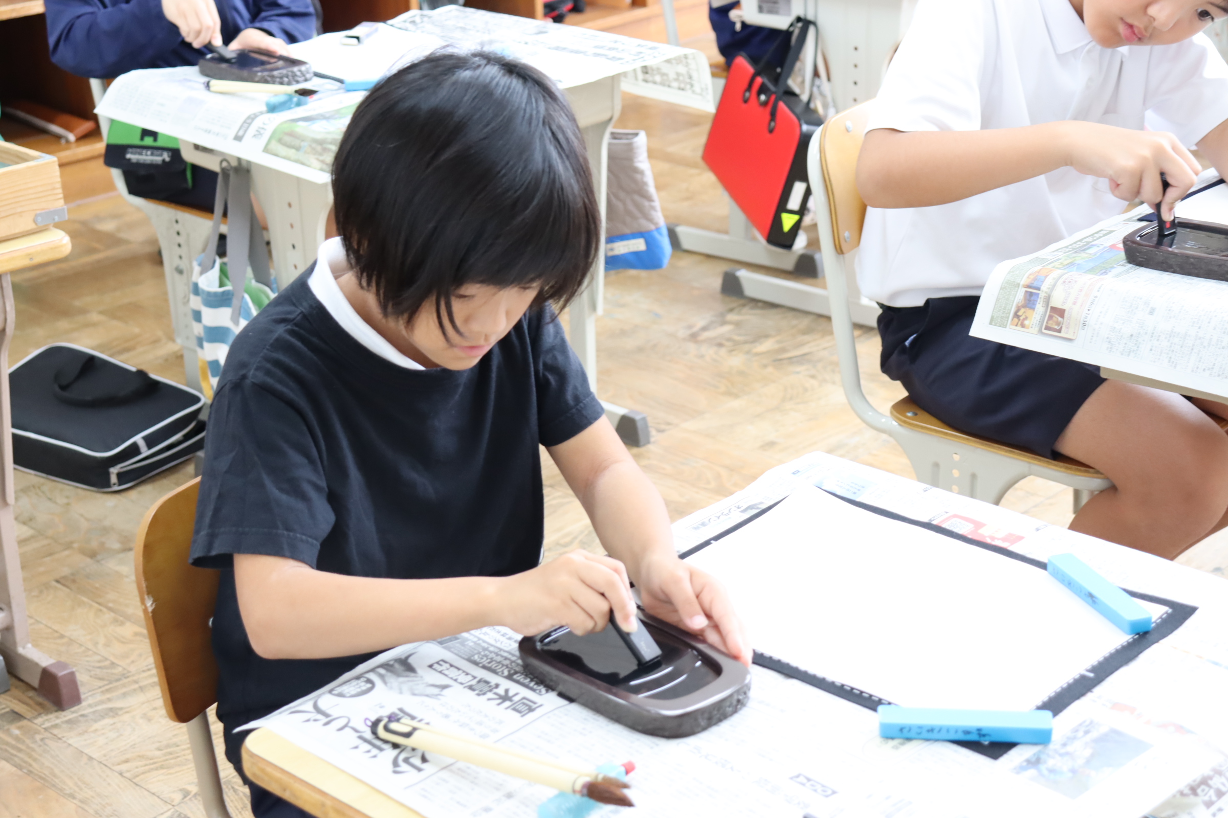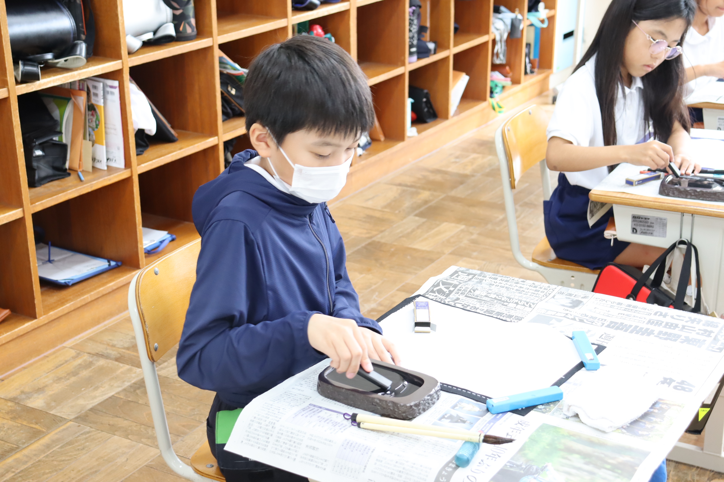 中学年は赤間硯を使っての習字教室を行いました。講師の先生より、赤間硯の制作にかける思いをお聞きして、子どもたちも大切に硯を扱いました。墨のすり方、や片付け方もしっかり学ぶことができました。山口県の誇りをまた一つ学ぶよい機会となりました。