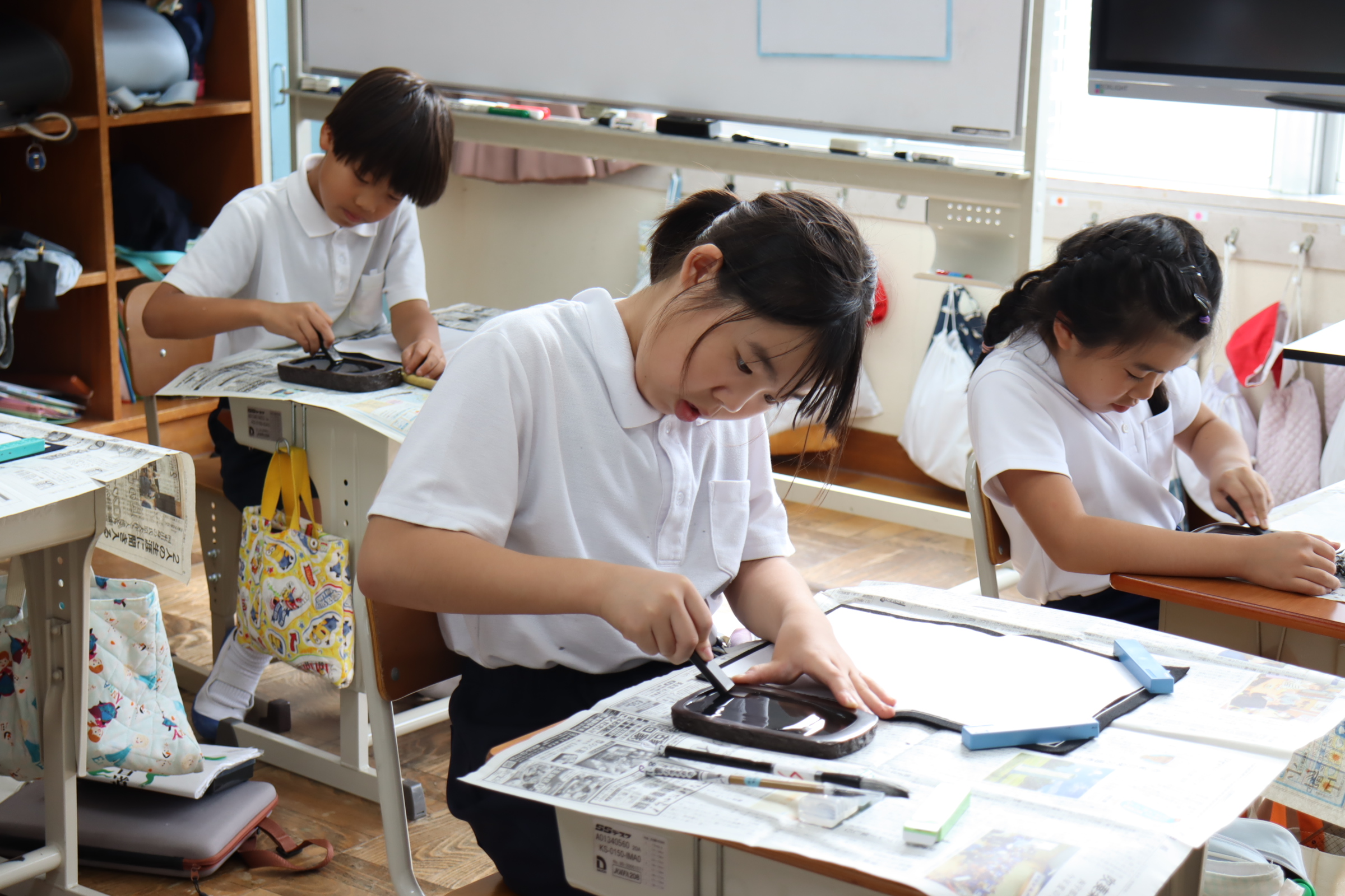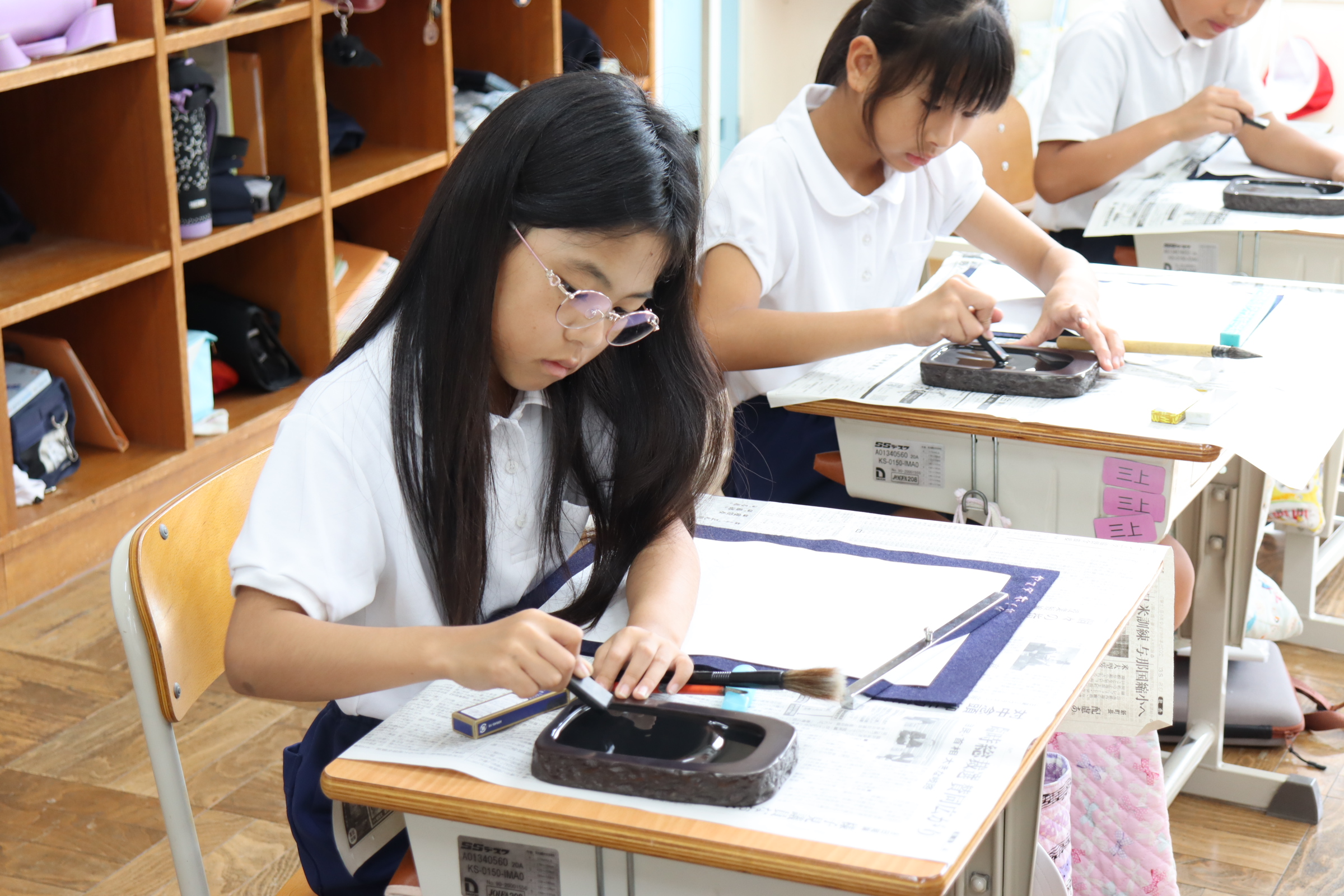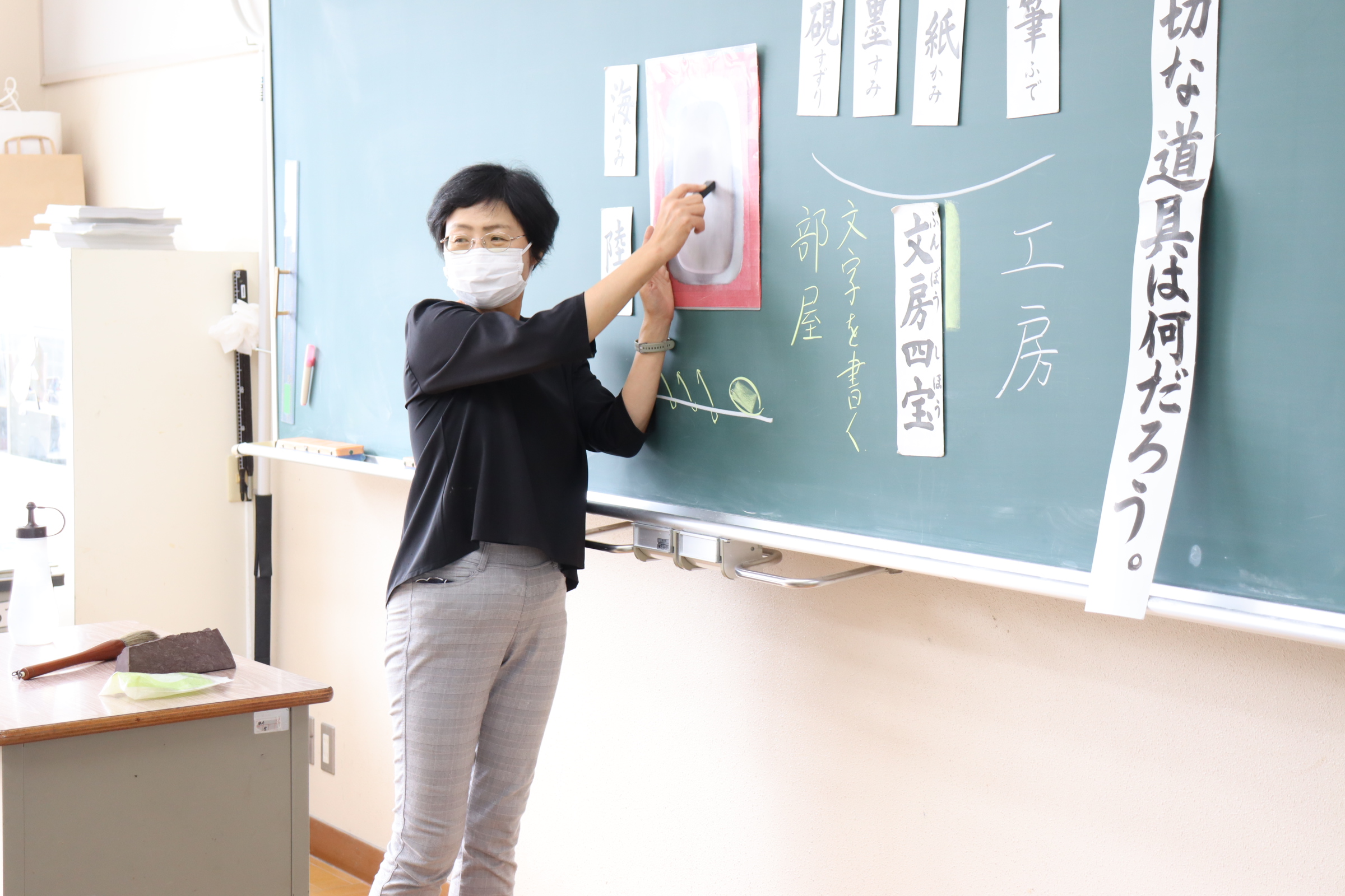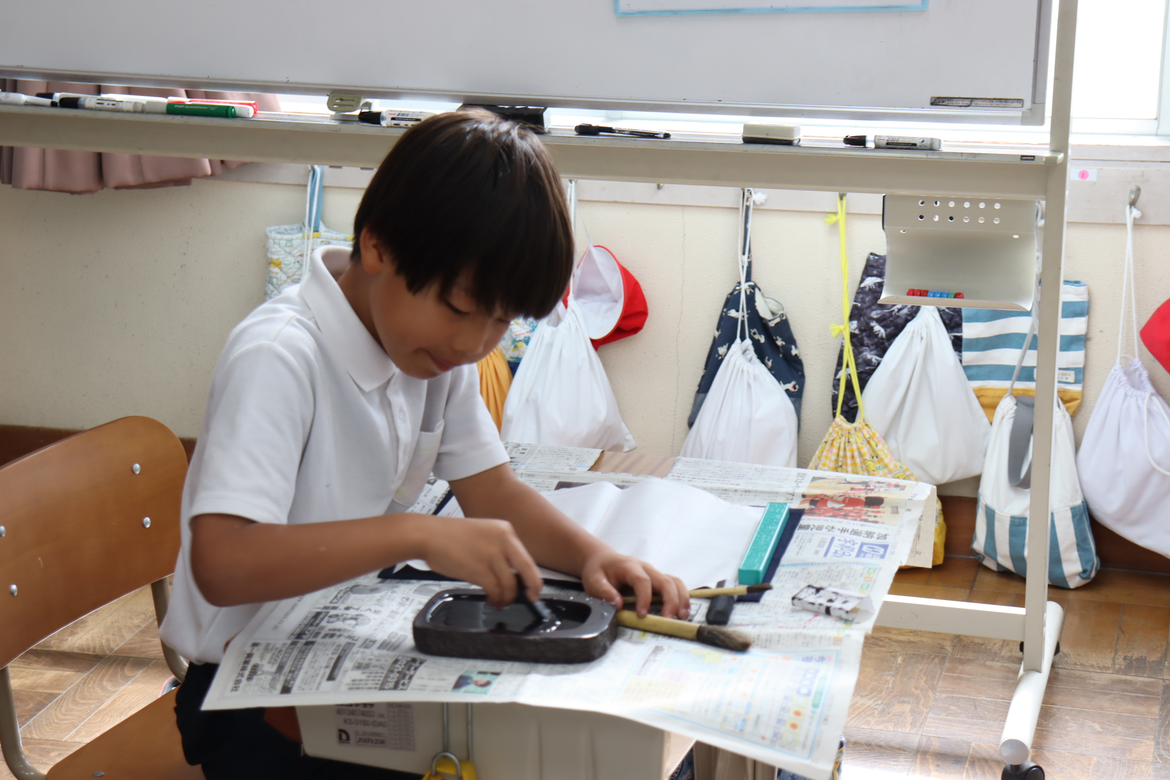 中学年は赤間硯を使っての習字教室を行いました。講師の先生より、赤間硯の制作にかける思いをお聞きして、子どもたちも大切に硯を扱いました。墨のすり方、や片付け方もしっかり学ぶことができました。山口県の誇りをまた一つ学ぶよい機会となりました。