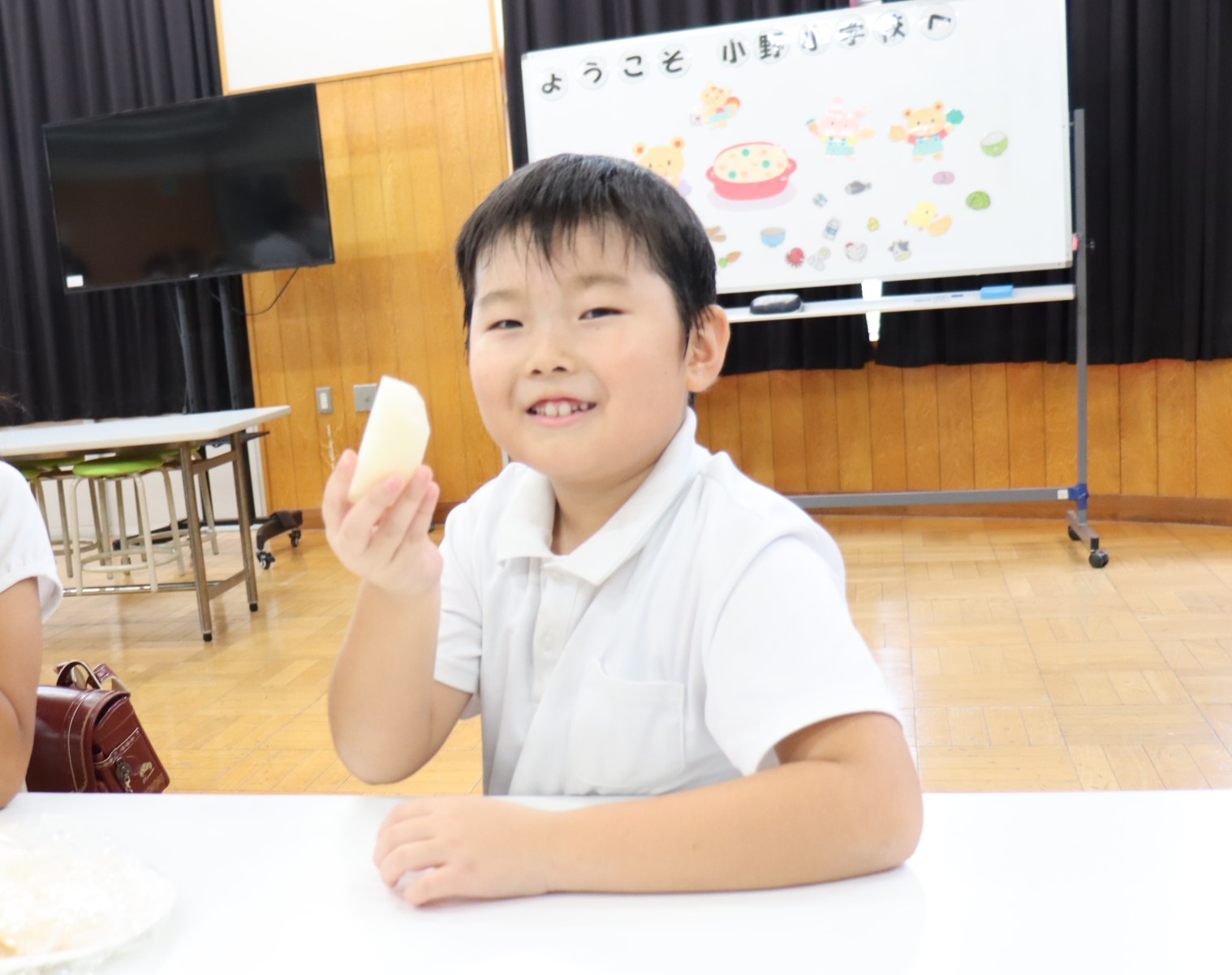 地域の方から梨をいただきました。毎年児童のために届けてくださっており、今年も大変おいしくいただきました。秋の実りを味覚で実感できるすてきな機会でした。旬の物を意識して食べるという経験がなかなかできにくくなっています。子どもたちのこれからの人生が豊かになる経験だったと感じました。ありがとうございます。